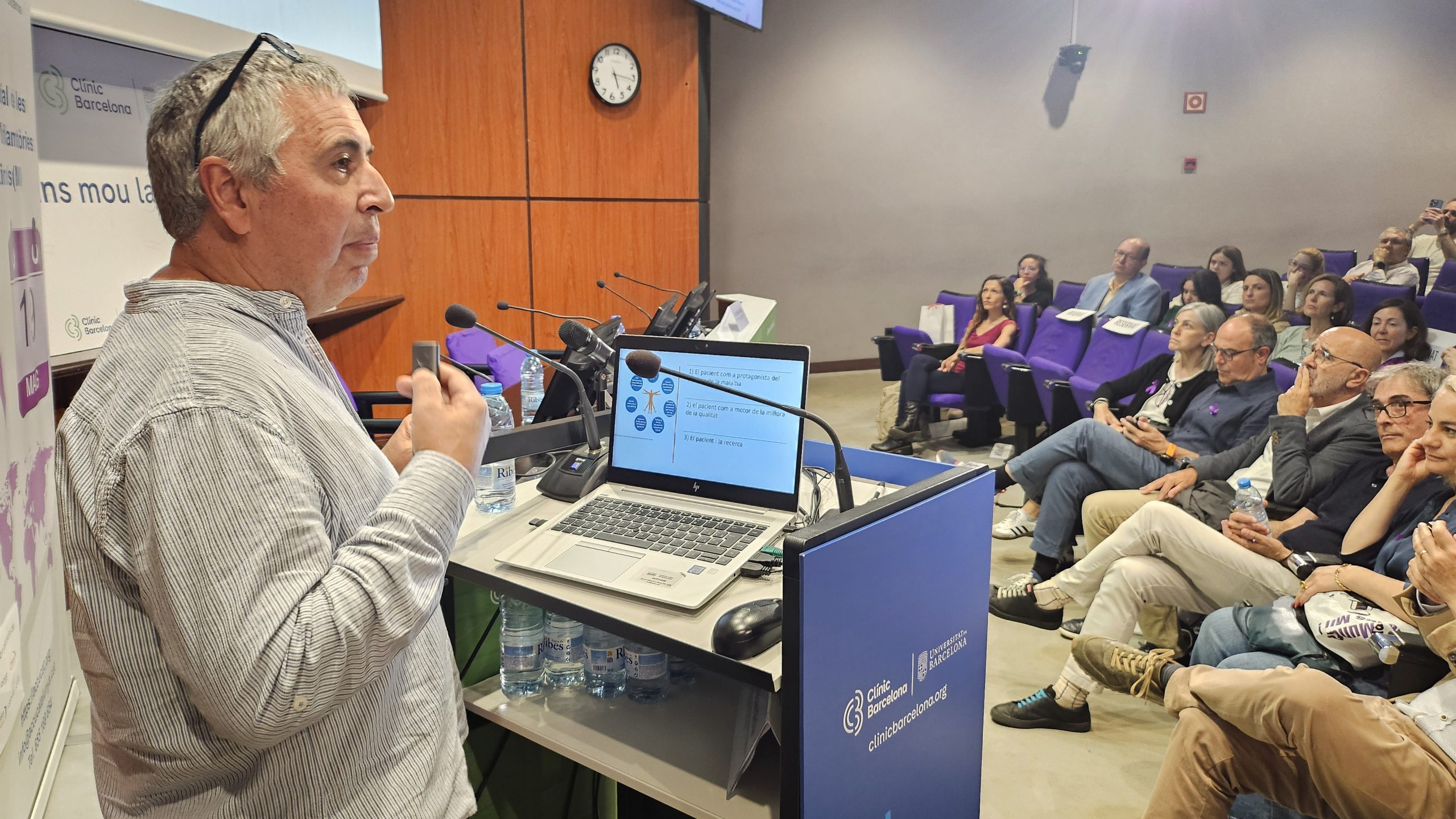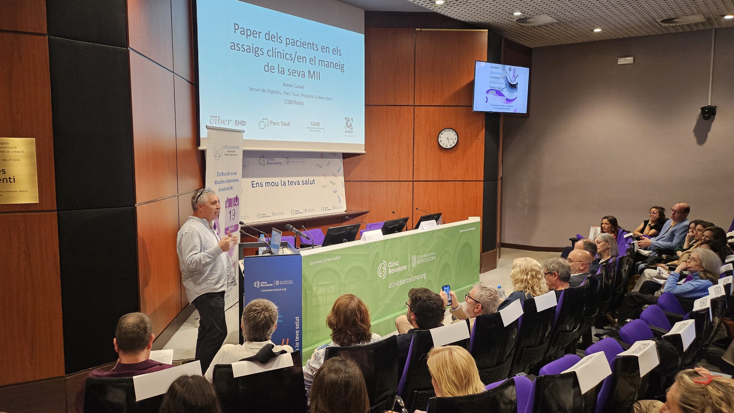 Ambas ponencias ofrecieron una visión complementaria y profundamente enriquecedora sobre el futuro de las EII desde dos perspectivas esenciales: la del paciente y la de la investigación biomédica. El Dr. Calvet destacó el papel central del paciente en el control de su enfermedad, reivindicando un modelo asistencial colaborativo donde las decisiones se toman de forma compartida, se fomenta la autogestión y la evaluación de la calidad de la atención a través de indicadores como los PROMs y PREMs. También defendió la importancia de la participación activa de los pacientes en estudios clínicos, no sólo como participantes sino como agentes transformadores e impulsores de proyectos desde las asociaciones. Por su parte, el Dr. Manyé expuso los grandes avances en el conocimiento de las EII a través de la genética, la inmunología y el estudio de la microbiota, así como las nuevas terapias personalizadas basadas en estos conocimientos. Destacó la importancia de la investigación en biomarcadores, la comprensión de la disbiosis intestinal y la exploración de nuevas estrategias como los trasplantes de microbiota o el uso de bacteriófagos. Ambos ponentes coincidieron en la necesidad de una aproximación integral y multidisciplinar que conecte la investigación más líder con la experiencia directa de los pacientes para avanzar hacia una medicina realmente personalizada y transformadora.