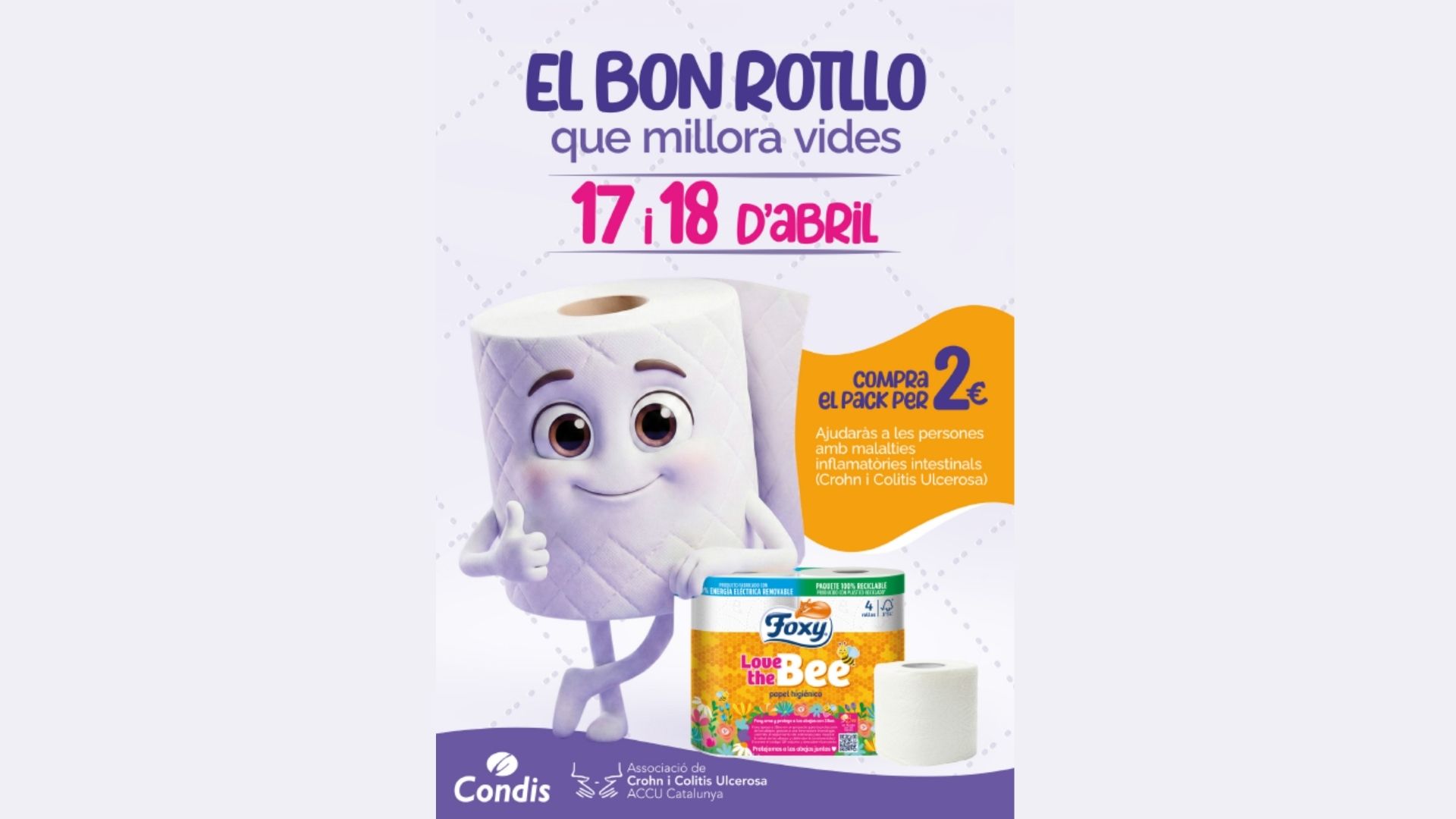 Sota el lema, “El bon rotllo que millora vides”, la iniciativa convida la ciutadania a sumar-se a una acció tan senzilla com significativa: adquirir un pack solidari de paper higiènic Foxy Love de Bee (4 unitats) a un preu simbòlic de 2 euros. Un gest quotidià que es transforma en suport directe a les persones que conviuen amb aquestes malalties.